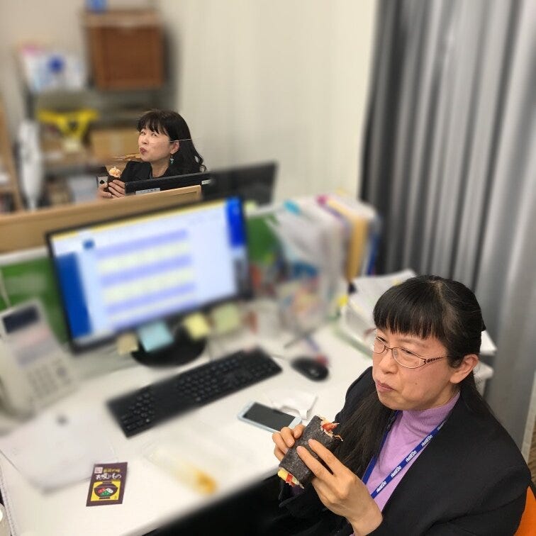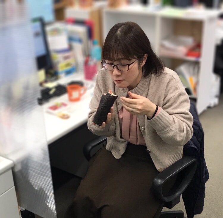 太巻きが太すぎて中身こぼしてる人。
