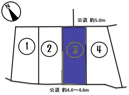 | 土地面積 | 実103.66㎡(31.35坪) | 接道 | 南西側(公道)幅 約4.0m 間口 約6.50m 北東側(公道)幅 約5.0m 間口 約3.31m |